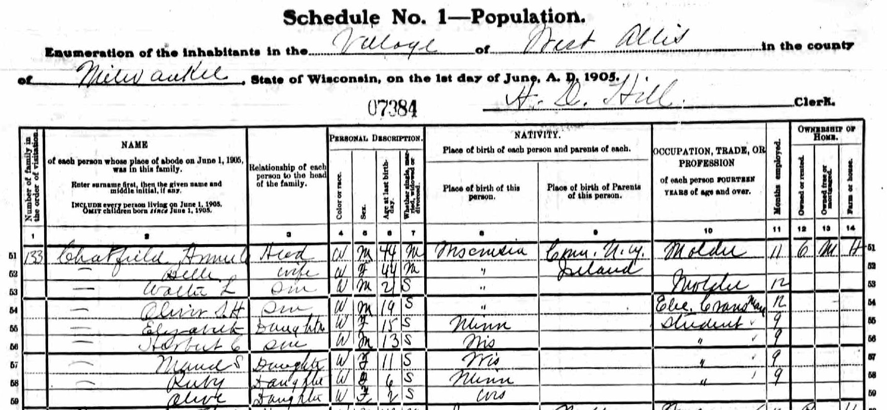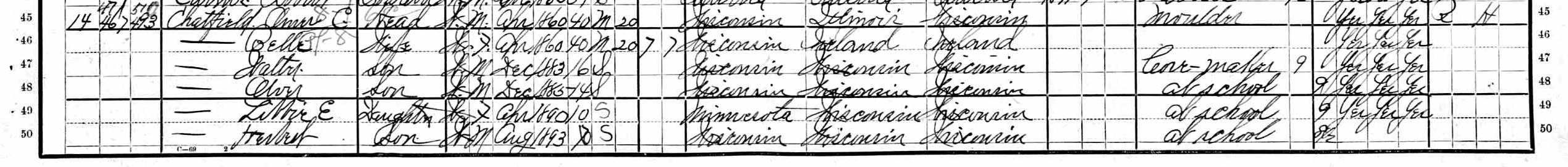 | Wisconsin, Births and Christenings Name: Walte Leroy Chatfield Gender: Male Birth Date: 14 Dec 1889 Birthplace: Whitewater, Walworth, Wisconsin Race: White Father's Name: Omer Corning Chatfield Father's Birthplace: Adams, Wisconsin Mother's Name: Isabelle Lackey Mother's Birthplace: Delevan, Elkorn Co., Wisconsin Indexing Project (Batch) Number: C00328-7 , System Origin: Wisconsin-EASy , GS Film number: 1305599 , Reference ID: 00835 ----- Wisconsin, Deaths and Burials Name: Omer C. Chatfield Gender: Male Death Date: 20 Jul 1908 Death Place: West Allis, Milwaukee, Wisconsin Age: 48 Birth Date: 1860 Father's Name: Silas B. Chatfield Mother's Name: Catherine Kling Indexing Project (Batch) Number: B03163-6 System Origin: Wisconsin-EASy GS Film number: 1013937 Reference ID: bk 274 p 204 cn 3250 ----- Find A Grave Memorial# 140531408 ===== USA Census, 1900 Name: Omer C Chatfield Event Place: ED 161 Beloit city Ward 2, Rock, Wisconsin Birth Date: Apr 1860 Birthplace: Wisconsin Relationship to Head of Household: Head Father's Birthplace: Illinois Mother's Birthplace: Wisconsin Race: White Gender: Male Marital Status: Married Years Married: 20 Marriage Year (Estimated): 1880 Page: 25 Sheet Letter: A Family Number: 510 Reference ID: 45 GS Film number: 1241814 Digital Folder Number: 004120639 Image Number: 00588 Household Gender Age Birthplace Head Omer C Chatfield M 40 Wisconsin Wife Belle Chatfield F 40 Wisconsin Son Walter Chatfield M 17 Wisconsin Son Olver Chatfield M 15 Wisconsin Dau Libbie E Chatfield F 10 Minnesota Son Herbert Chatfield M 7 Wisconsin Dau Maude L Chatfield F 6 Wisconsin Dau Ruby Chatfield F 2 Minnesota ----- Wisconsin, State Census, 1905 Name: ?Nnule Chatfield Residence Place: West Allis, Milwaukee, Wisconsin Age (Original): 44y Birth Year (Estimated): Abt 1861 Birthplace: Wisconsin Relationship to Head of Household: Head Race: White Gender: Male Marital Status: Married Parent 1 Birthplace: Connecticut Parent 2 Birthplace: New York Family Number: 133 Page: 8 Line Number: 51 GS Film number: 1020991 Digital Folder Number: 4236874 Image Number: 00126 Household Gender Age Birthplace Head ?Nnule Chatfield M 44y Wisconsin Wife Belle Chatfield F 44y Wisconsin Son Walter L Chatfield M 21y Wisconsin Son Oliver S H Chatfield M 19y Wisconsin Dau Elizabeth Chatfield F 15y Minnesota Son Herbert C Chatfield M 13y Wisconsin Dau Maud S Chatfield F 11y Wisconsin Dau Ruby Chatfield F 6y Minnesota Dau Olive Chatfield F 2y Wisconsin |